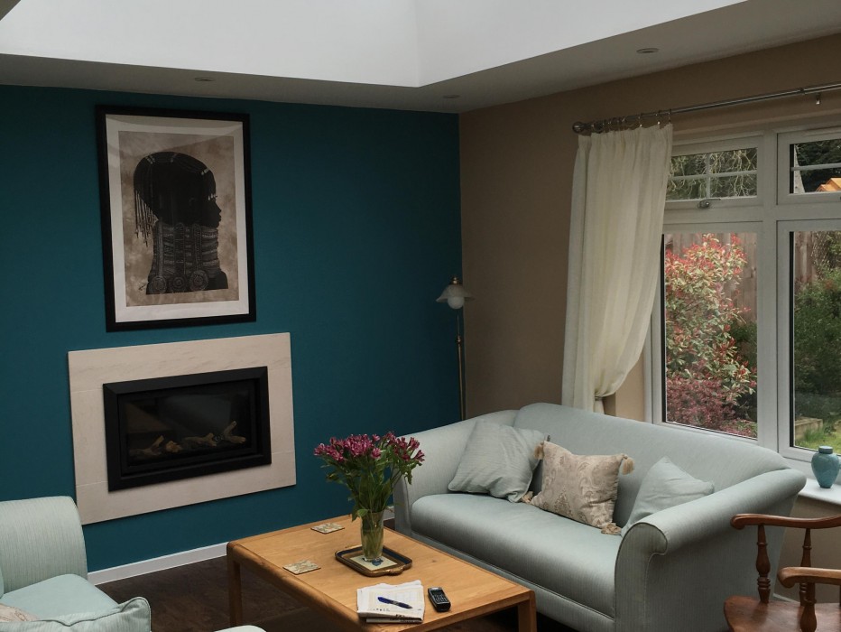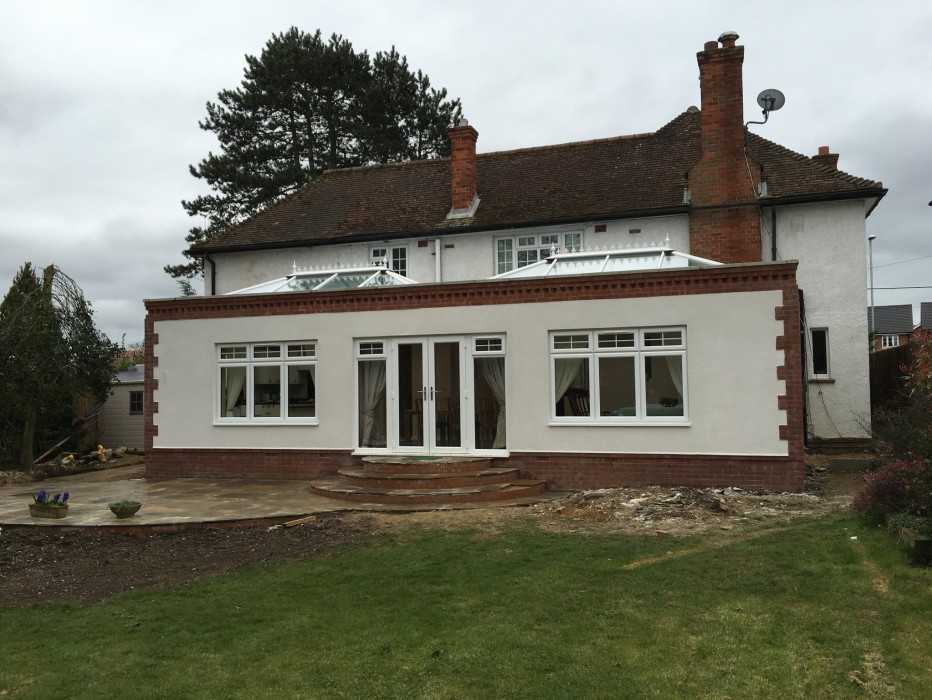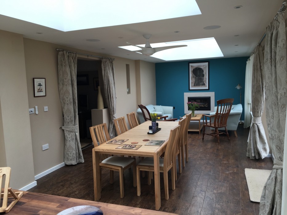 Double orangery 12m x 4m incorporating new kitchen , dining area and sitting room with gas fire